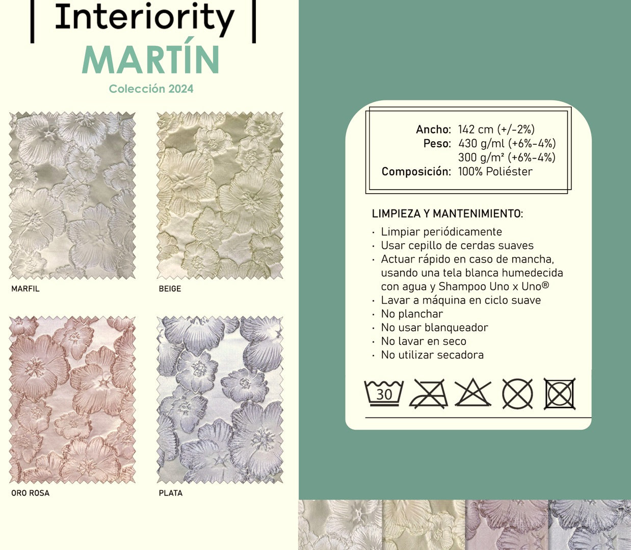 4 colores en carta: marfil, beige, oro rosa, plata.